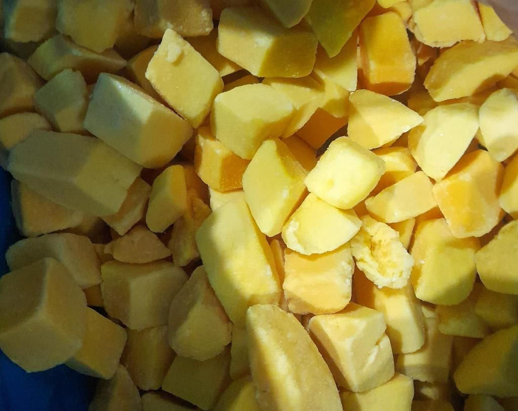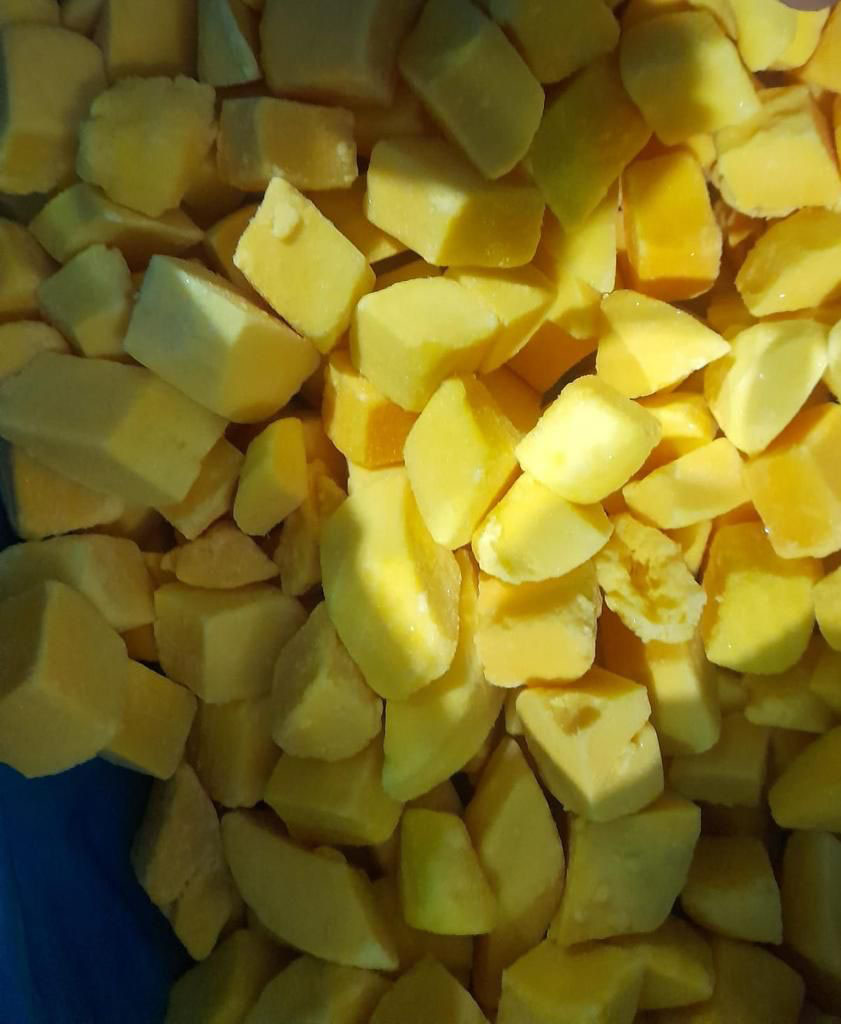 Product made from KENT variety in optimal condition and maturity. The process includes an IQF freezing process and all boxes pass through a metal detector and are stored at -18° Celsius. The product is processed according to good manufacturing practices and using HACCP principles.